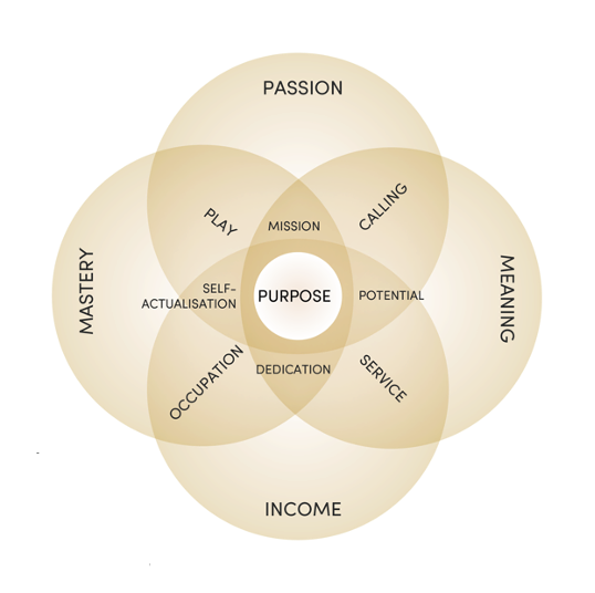 The Meira logo also enjoys similar color characteristics that represent that same sense of life, growth and safety. The floral pattern is meant to evoke the idea of Venn diagram (also called a Venn Purpose Diagram). The below diagram by Anaïs Bock can help visualize the connection between all areas of our life—for example, those of Passion, Play, Meaning, Purpose, Potential and Occupation—as a means of illumination.